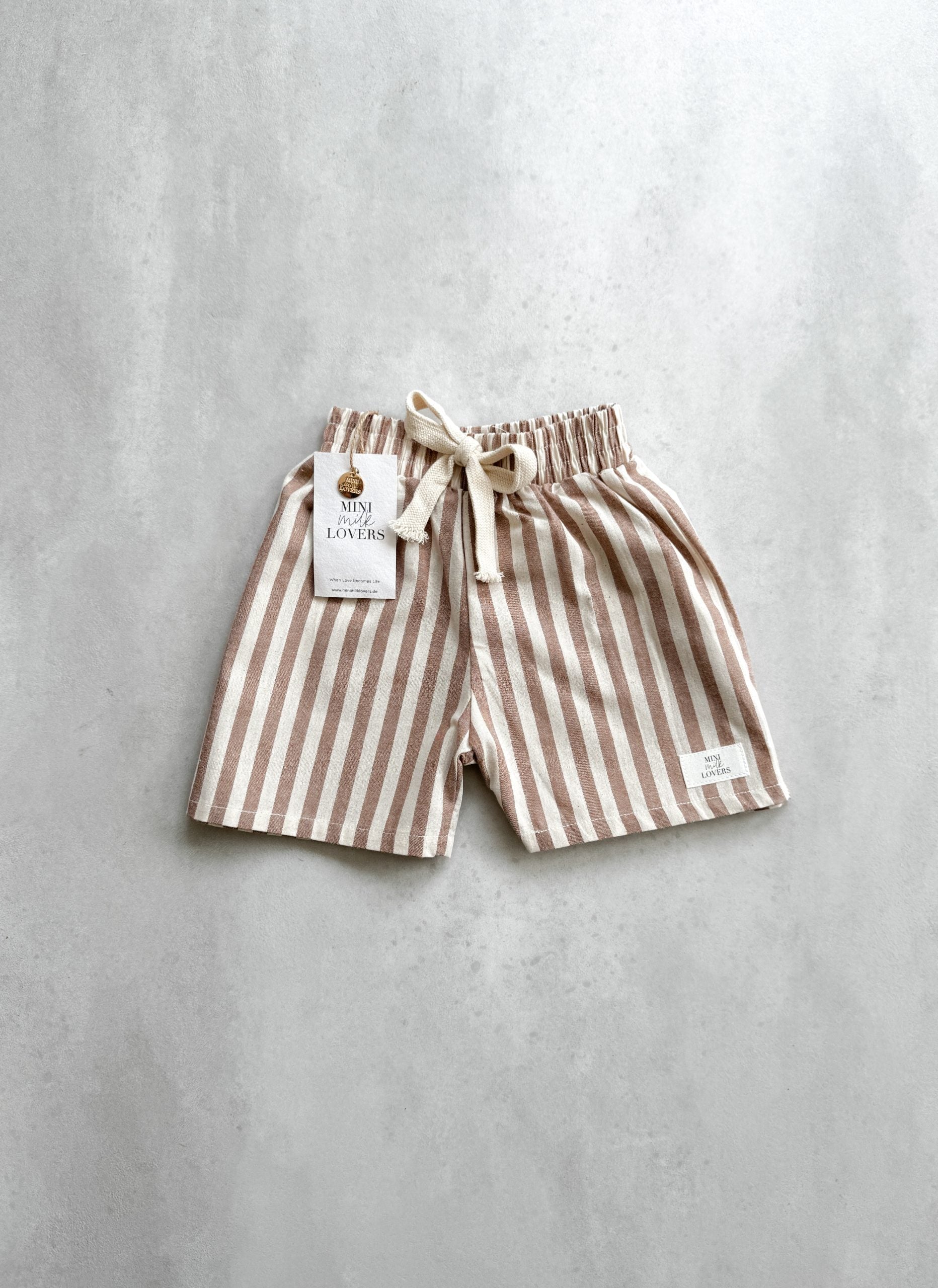 Diese super süße streifen Shorts in Dunkelbeige ist aus ganz leichtem Bio Baumwoll Stoff von Hand gefertigt. Die Shorts hat ein elastisches Bündchen, so das ein super bequemer Tragekomfort garantiert ist. Ein absolutes Must Have für die anstehende Sommer Saison. Handmade aus Deutschland!