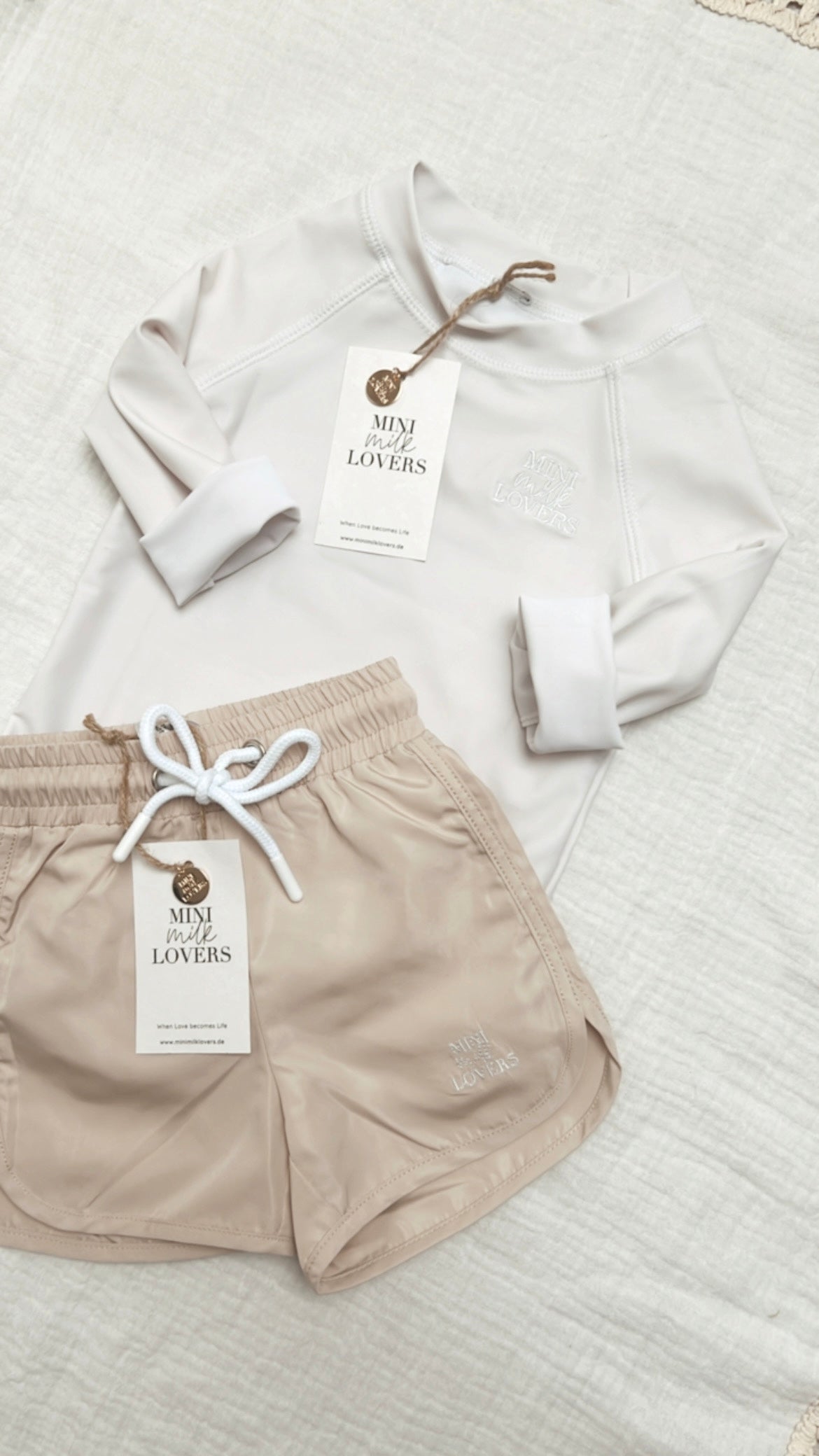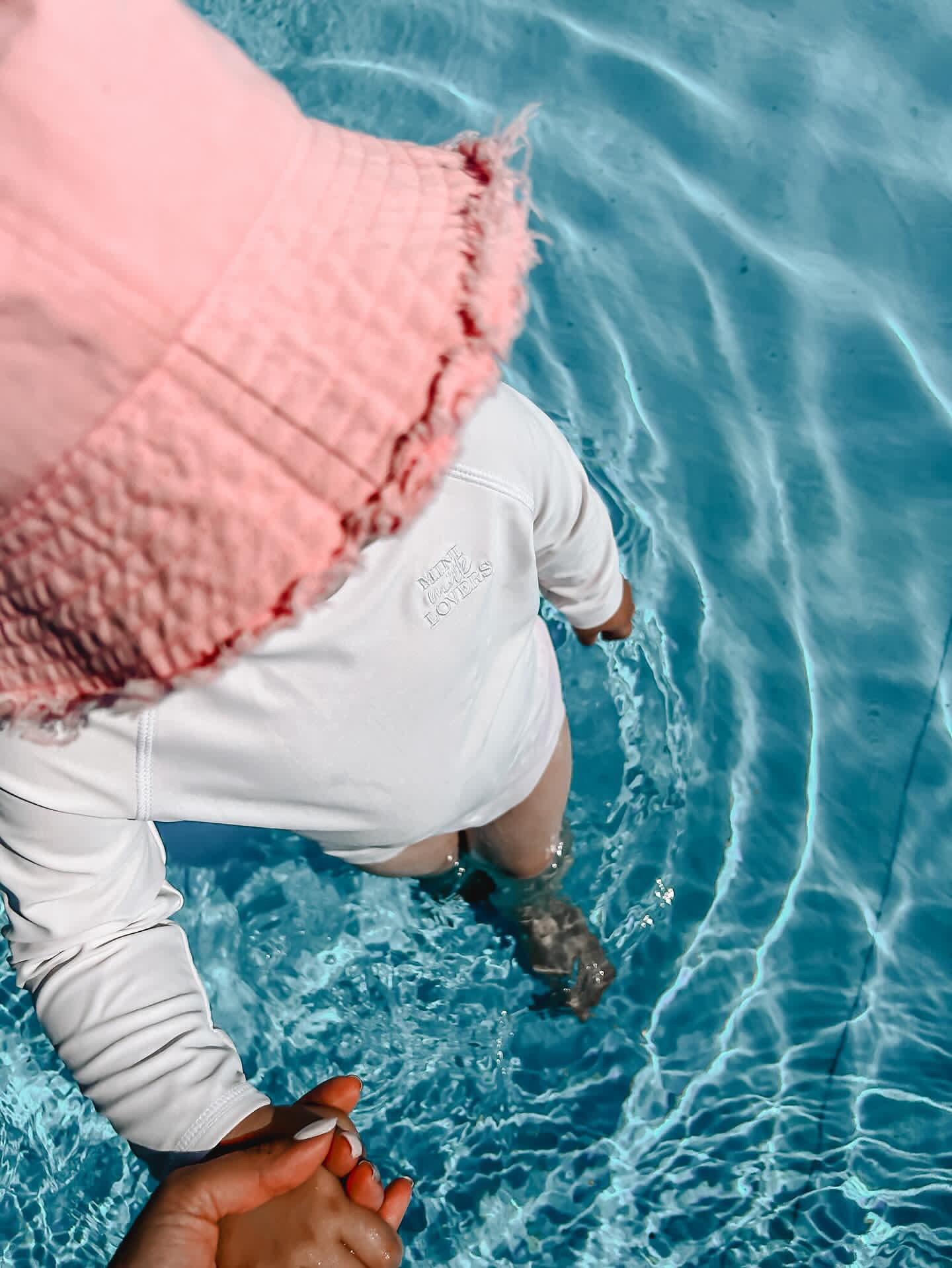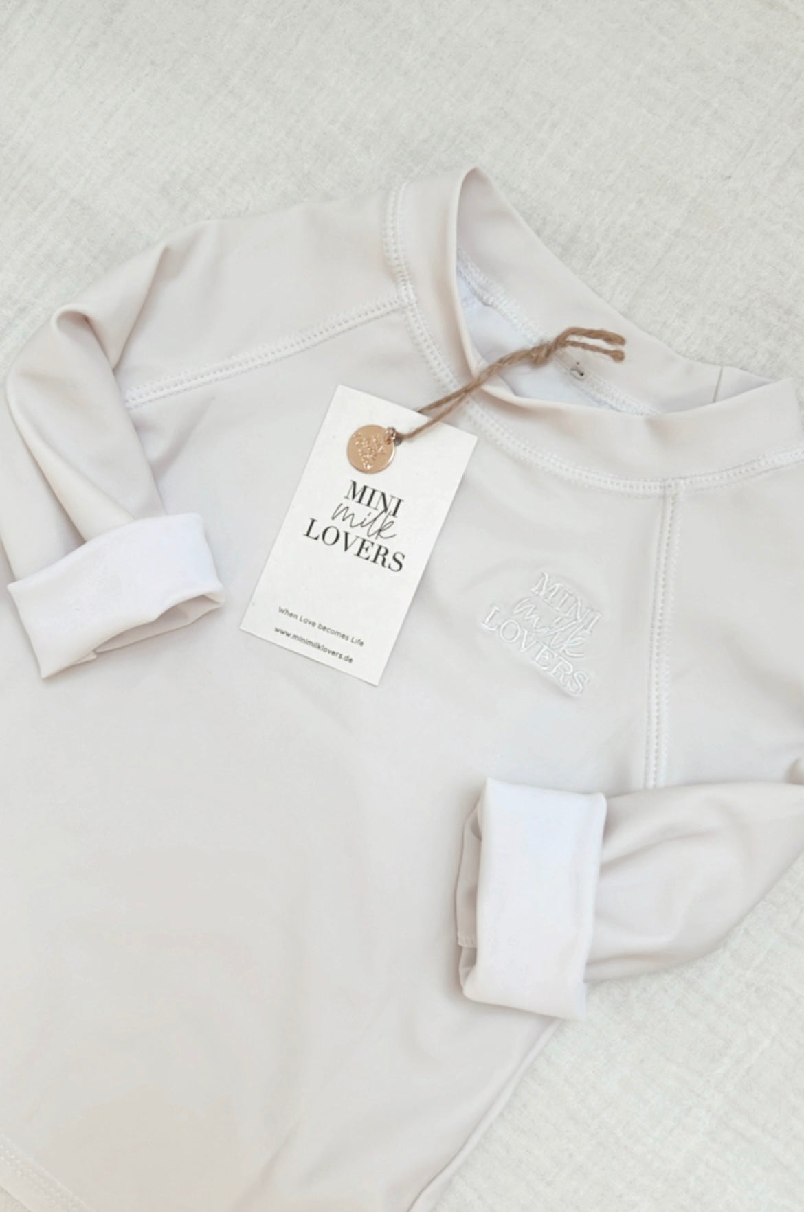 Schlichtes UV Shirt mit einem Lichtschutzfaktor 50+. Wir haben extra die Farbe Milky White gewählt, einen Farbton der die Sonne nicht so sehr anzieht, im Vergleich zu einer dunkleren Farbe. An einem wie gemalt schönen Urlaubstag streifst Du Deinem Baby/Kind dieses UV Shirt über. Beim schwimmen, planschen, Sandburgen bauen und entspannen, schützt es Dein Baby/Kind optimal vor der UV-Strahlung und anderen Hauteinflüssen. Er wurde liebevoll aus Econyl, einer recycelten und nachhaltigen Nylonfaser hergestellt. Ökotex Standard 100, Handmade.