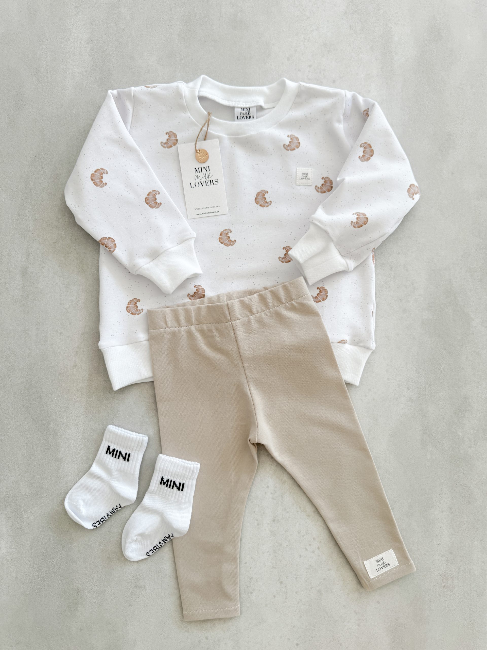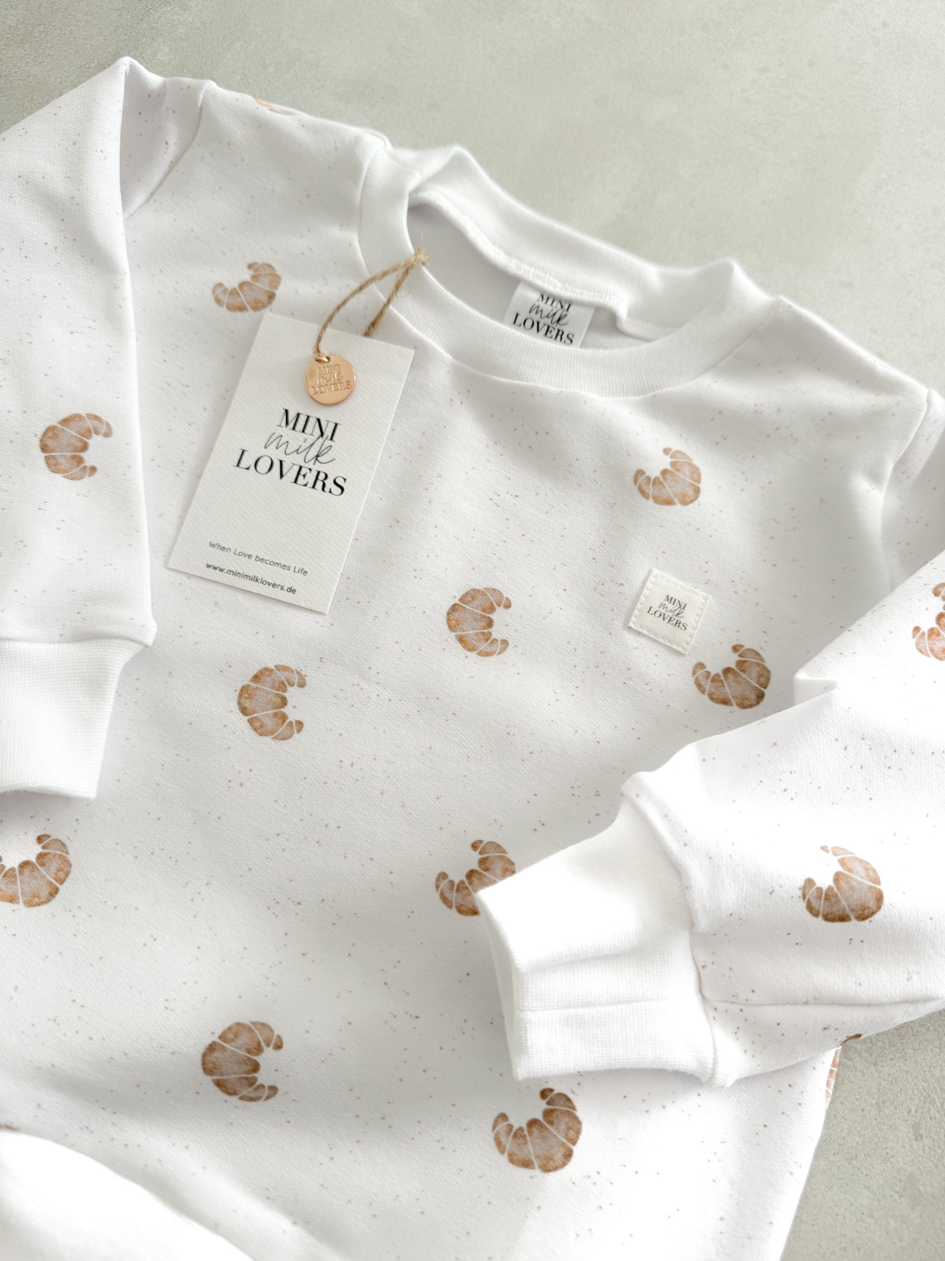Croissant Sweatshirt, liebevoll handgefertigt in Deutschland. Dieser süße und bequeme Sweater kratzt nicht, ist atmungsaktiv und wurde mit hochwertiger ÖkoTex Baumwolle gefertigt. Perfekt für den täglichen Gebrauch. Der Sweater kann leicht mit anderen Kleidungsstücken kombiniert werden. Auch perfekt zum verschenken für Baby Showers, Weihnachten, Taufe und Geburtstage.