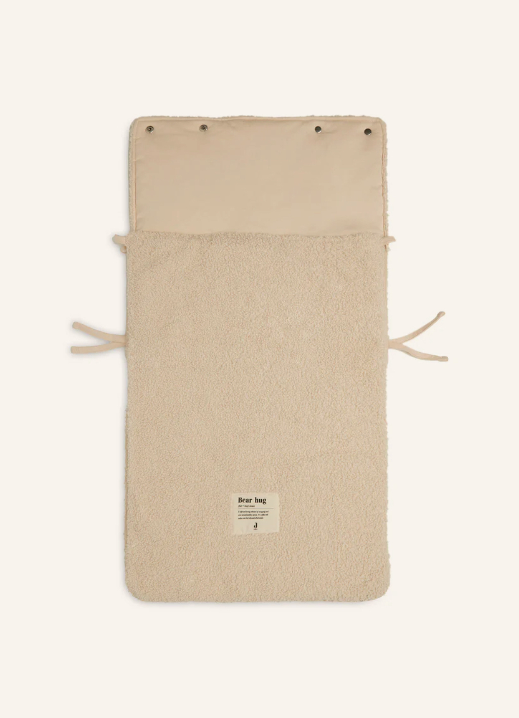 Ein Fußsack ist wirklich praktisch. Und dieser Fußsack aus super kuscheligem Bouclé ist einfach nur wunderschön! Auf der Vorderseite des Fußsacks befindet sich ein niedliches Bear Hug-Logo. Du kannst dein Baby ganz einfach in den Fußsack legen, indem du zuerst den Reißverschluss des Sacks vollständig öffnest. Du kannst dein Baby auch ganz einfach aus dem Autositz nehmen, indem du den Fußsack vollständig öffnest. Von oben lässt er sich mit einem Druckknopf schnell in eine Mütze verwandeln, damit der Kopf auch warm bleibt, sobald du den Autositz draußen trägst oder spazieren gehst. Damit es deinem Baby im Auto nicht zu heiß wird, öffnest du den Reißverschluss des Sacks einfach so weit wie nötig. Kurzum: eine super praktischer, bequemer Artikel für dein Baby. Der Fußsack hat hinten Öffnungen, um das Anschnallen der Gurte besonders einfach zu machen. Es ist ein universeller Fußsack für den Maxi Cosi und alle anderen Autokindersitze der Kategorie 0 mit Drei- oder Fünf-Punkt-Gurten. Du kannst diesen Fußsack auch im Kinderwagen verwenden. Dein Baby ist im Handumdrehen warm eingepackt für den Spaziergang.