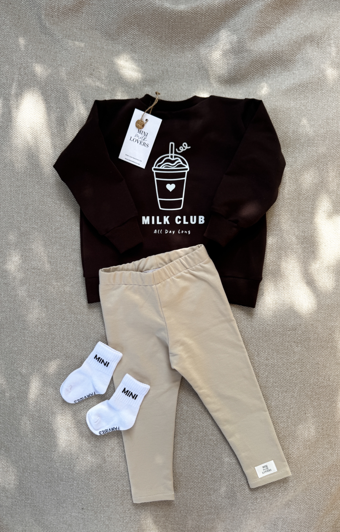 Milk Club Sweatshirt in Chocolate Brown. Liebevoll handgefertigt in Deutschland. Dieser süße und bequeme Sweater ist angenehm zu tragen, kratzt nicht, ist atmungsaktiv und wurde mit hochwertiger ÖkoTex Baumwolle gefertigt. Perfekt für den täglichen Gebrauch. Der Sweater kann leicht mit anderen Kleidungsstücken kombiniert werden. Ein super schönes Geschenk für Baby Showers oder Geburtstage.